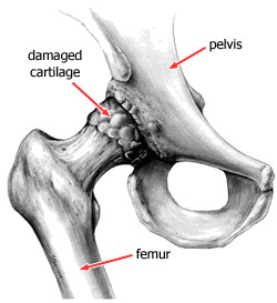 This drawing of an arthritic hip shows how the cartilage covering the leg bone (femur) and the acetabulum of the hip become damaged over time.